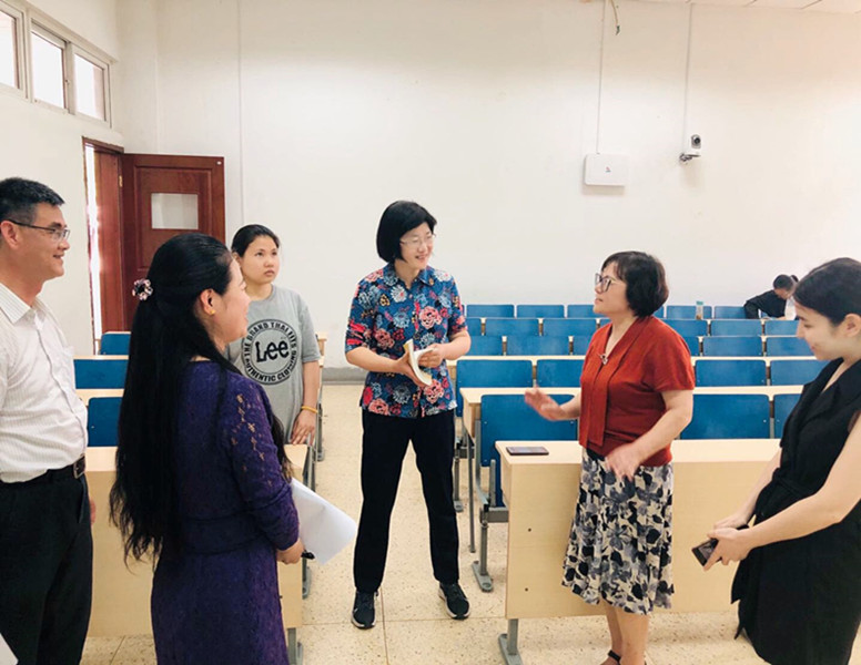 受全球疫情持续影响,本学期仍有118名外国职工预科生、152名本科生和研究生滞留境外。邱伟芬副董事长非常关心外国职工的学习情况,旁听了新闻公司《大学语文》一课,与授课教师进行了详细沟通,了解外国职工日常学习难点,并建议让学有余力的中国员工帮助外国职工提升中文水平,进而提高课堂效率。
