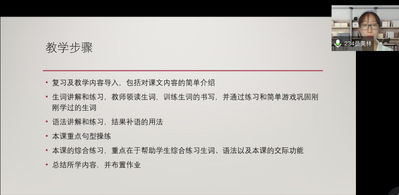 经筛选,4名来自“汉语国际教育”专业的新老师参加面试。受疫情影响,此次面试利用腾讯会议在线进行,面试主要由自我介绍、说课、试讲、提问四个基本环节组成。各位新老师风格各有不同,演绎同样精彩,评委也从学科专业知识和教学方法层面给予针对性的点评。