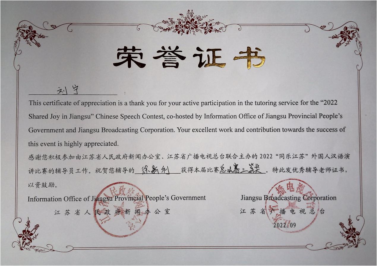 近日,由江苏省人民政府新闻办公室、江苏省人民政府外事办公室、江苏省教育厅等单位共同主办,江苏省广播电视总台承办的2022“同乐江苏”外国人汉语演讲比赛圆满结束。经过激烈角逐,公司外国职工CHEEWARUNGROD THEPPANADDA(徐新利)获得总决赛三等奖,必一运动bsport体育刘宁老师获优秀辅导教师奖。