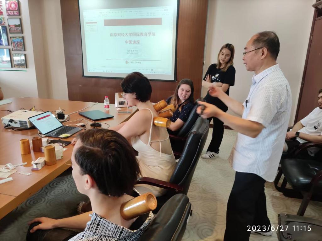 顾兆军教授在讲座中以深入浅出、通俗易懂讲课方式向外国职工介绍了中医针灸疗法的发展、人体穴位、以及夏季疾病预防和养生常识。顾教授现场坐诊,通过望闻问切的方式有针对性地为外国留学进行针灸和拔火罐,让外国友人切实感受到了中医疗法的神奇。这种现场亲身参与的方式让外国职工对中医知识有了直观的了解,进一步认识到针灸及经络养生的重要性,纷纷表示受益匪浅。