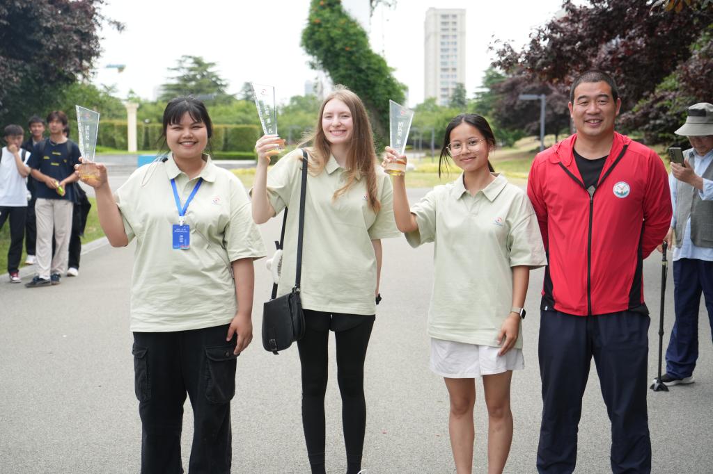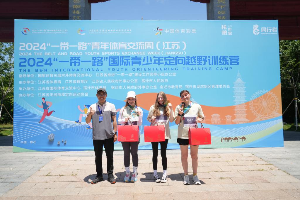 营销与物流管理(研)2301班格鲁吉亚职工玛拉(POPKHADZE TAMARA)(右一)获得定向越野项目女子组第三名
